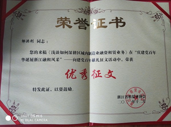 同時,浙江臺金融資租賃有限公司選送參加“慶建黨百年華誕展浙江融租風采”向建黨百年獻禮征文活動的文章——《淺談如何深耕區(qū)域內(nèi)制造業(yè)融資租賃業(yè)務(wù)》,在各類選送作品中脫穎而出,入選“優(yōu)秀征文”名單。
