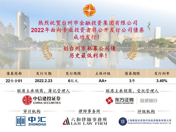 開年之際,市金投集團于資本市場內(nèi)再嘗試再出發(fā)!集團計劃財務(wù)部積極響應(yīng)國家、省、市政策號召與集團融資工作部署,于2月23日成功面向?qū)I(yè)投資者非公開發(fā)行公司債券(私募公司債)6億元,創(chuàng)臺州市私募公司債歷史最低利率。