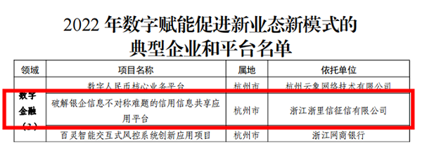 近日,浙江省發(fā)展改革委公布了2022年數(shù)字賦能促進(jìn)新業(yè)態(tài)新模式的典型企業(yè)和平臺(tái)名單,市金投集團(tuán)參股公司天道金科下屬企業(yè)以“破解銀企信息不對(duì)稱難題的信用信息共享應(yīng)用平臺(tái)”成功入選。