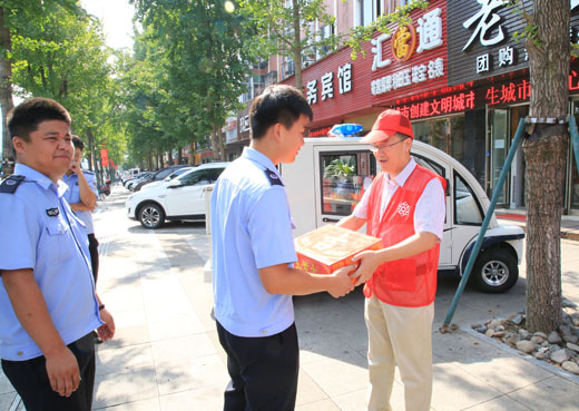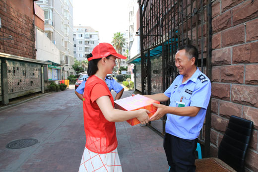 “送清涼”小分隊(duì)走進(jìn)星河苑小區(qū),志愿黨員代表呂志華為門(mén)口站崗的保安人員送上飲料,保安大叔笑開(kāi)了花。