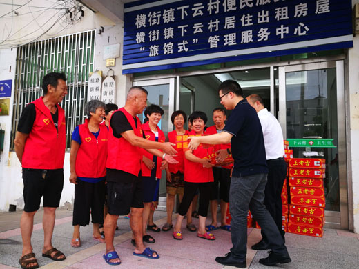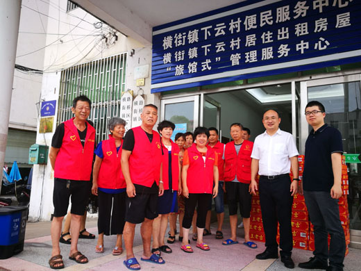 支部委員許長(zhǎng)松攜駐村督導(dǎo)服務(wù)組成員陳力行趕赴橫街鎮(zhèn)下云村為當(dāng)?shù)氐纳鐓^(qū)志愿服務(wù)者以及環(huán)衛(wèi)工人送“清涼”。