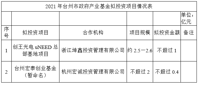 根據(jù)《臺州市政府產(chǎn)業(yè)基金管理辦法》 (臺財(cái)企發(fā)〔2021〕6號)等有關(guān)規(guī)定,為發(fā)揮政府產(chǎn)業(yè)基金引領(lǐng)作用,臺州市政府產(chǎn)業(yè)基金擬投資的2個(gè)項(xiàng)目(含1個(gè)定向基金),已由臺州市金融投資集團(tuán)有限公司決策委員會(基金管理委員會)審議通過,現(xiàn)將所有擬投資項(xiàng)目予以公示。如有意見,可向市金投集團(tuán)反映。