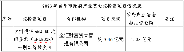 根據(jù)《臺州市政府產(chǎn)業(yè)基金管理辦法》(臺財企發(fā)〔2021〕6號)等有關(guān)規(guī)定,為發(fā)揮政府產(chǎn)業(yè)基金引領(lǐng)作用,臺州市政府產(chǎn)業(yè)基金擬投資的1個項目(定向基金),已由臺州市金融投資集團有限公司決策委員會(基金管理委員會)審議通過,現(xiàn)將擬投資項目予以公示。如有意見,可向市金投集團反映。