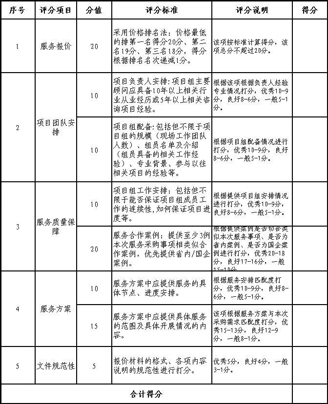 采用綜合比選方式,總得分為100分。根據(jù)評審結(jié)果,從高到低選擇1家服務(wù)供應(yīng)商作為本次采購服務(wù)的合作機構(gòu)。